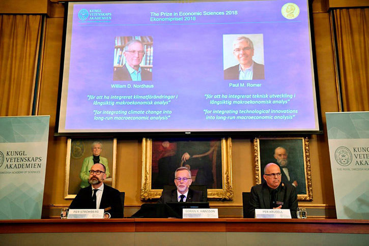 William Nordhaus of Yale University and Paul Romer of New York University were announced winners of the 9-million-kronor ($1.01 million) prize on Monday by the Royal Swedish Academy of Sciences.