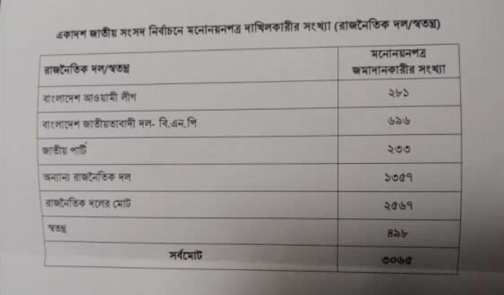 Of the aspirants, 281 candidates filed nominations on behalf of AL, 696 on behalf of BNP, 233 on behalf of Jatiya Party and 1,357 from other parties.
