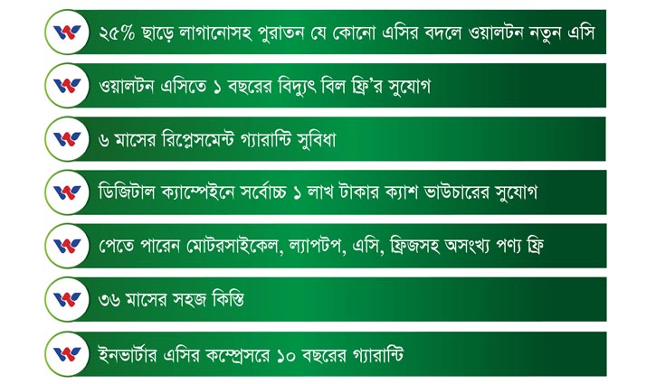 Under the nationwide ongoing Walton Digital Campaign Season 4, customers of 1-ton, 1.5 ton and 2 ton AC of Walton brand are likely to get Tk 14,600, Tk 18,000 and Tk 21,600 as one year electricity bill through registering their purchased AC. Customers are enjoying the offer from March 1.