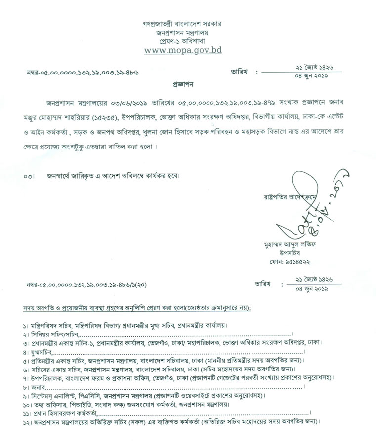 Secretariat Correspondent: The government has reversed the transfer of Manjur Mohammad Shahriar, deputy director of the Directorate of National Consumer Rights Protection.