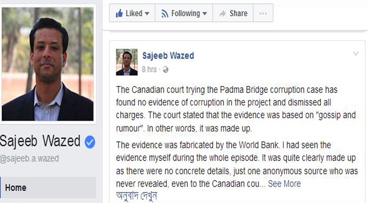 Information and Communication Technology Adviser to the Prime Minister Sheikh Hasina came up with the reaction in a post on his verified Facebook page after a Canadian court dismissed an international bribery case linked to the project yesterday at the prosecution's request.
