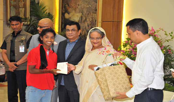 During the reception programme, the premier handed over a cheque of Tk10 lakh to each player and Tk5 lakh to each employee. Later, she handed over prizes and gifts among the under-16 girls.
