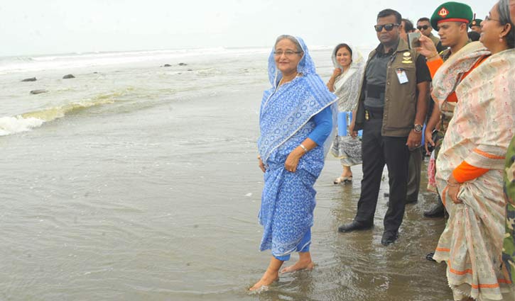 Staff Correspondent: Prime Minister Sheikh Hasina has walked bare footed at Inani sea beach at Ukhia in Cox's Bazar.