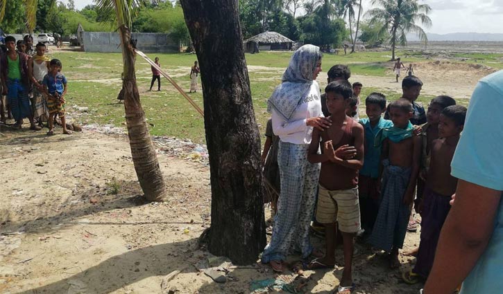 From there, she went to Bhanga of Shah parir Dweep in Teknaf where Rohingyas fled to Myanmar took shelter and talked to the children there. She heard tale of oppression conducted by Myanmar army. Later, she posed for images with Rohingya children.