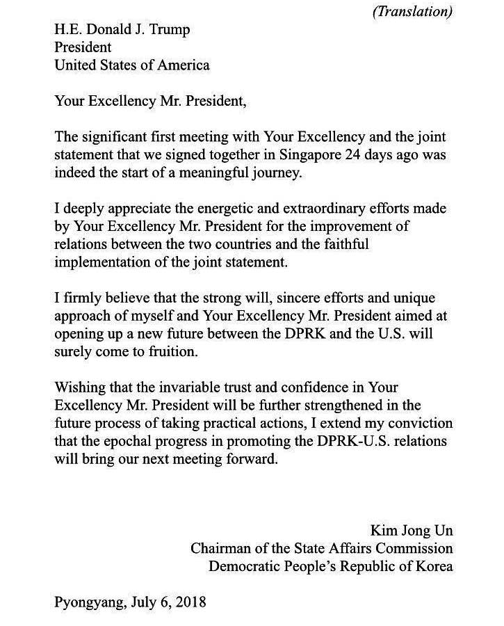 "I firmly believe that the strong will, sincere efforts and unique approach of myself and Your Excellency Mr. President aimed at opening up a new future between the DPRK and the US will surely come to fruition," Kim writes.