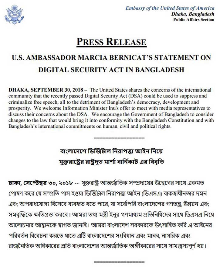 Staff Correspondent: The United States has encouraged the government of Bangladesh to consider changes to the recently passed Digital Security Act-2018.