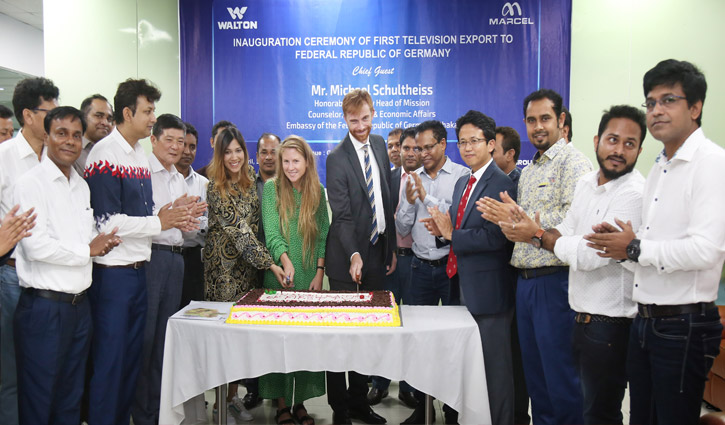 Michael Schultheiss, deputy head of mission for Counselor, Political and Economic Affairs of German Embassy in Dhaka, SM Ashraful Alam, Managing Director of Walton Hi-Tech Industries Limited (WHIL) and Director Raisa Sigma Hima inaugurated the country’s first-ever television export to Germany by cutting ribbon and cake.
