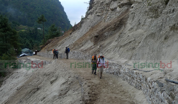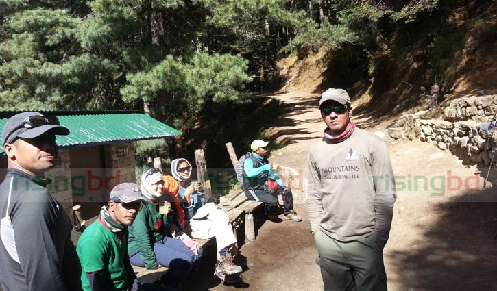 সকাল নয়টার সময় আমরা নামচে বাজার থেকে মেনদের উদ্দেশ্যে হাঁটা শুরু করলাম। বাজারের ভেতর দিয়ে আস্তে আস্তে চলে এলাম হেলিপ্যাডের কাছে। বাজারের উপরে হেলিপ্যাড। এখানে কিছু সময় বিশ্রাম নিয়ে আবার হাঁটা শুরু করলাম। আজ তেমন খাড়া চড়াই বা কঠিন পথ নাই। আঁকাবাঁকা উঁচুনিচু পথ। বার্জ, রটড্রেন্ড্রন ও পাইন বনের ভেতর দিয়ে হেঁটে চলছি। উঁচু উঁচু গাছের ফাঁক দিয়ে সুর্যের আলো শিল্পকর্ম করছে। আলো ছায়ার খেলার ছলে হাঁটছি আজ। ছবিও তুলছি। এখন আবহাওয়া ভালো। রোদও আছে। হাঁটতে হাঁটতে দুপুরের খাবারের সময় হয়ে গেলো। রাস্তার পাশে একটি ছোট রেস্টুরেন্ট দেখে খেতে বসলাম। খাবার তৈরী হচ্ছে। আমরা বসে বসে আড্ডা দিতে শুরু করলাম। আজ রান্না ঘরে মুহিত ভাই আর ছায়াবিথী আপু। রান্না শেষে আমরা খেতে বসলাম। মুহিত ভাই ডিম ভাজি করেছেন আর ছায়াবিথী আপু ডাল রান্না করেছেন। আর আমরা খাবার ধ্বংসের অপেক্ষায় দাঁতে শান দিচ্ছি। ঘুম থেকে উঠে সাতটার মধ্যে ব্যাগ নিয়ে আমরা ডাইনিং-এ চলে এলাম। খাবার শেষে আমরা মাসালা চা পান করলাম। এমন সময় একদল অস্ট্রেলিয়ানদের সাথে আড্ডা হলো। তারা এভারেস্ট বেসক্যাম্প ঘুরে এসেছে। নারী পুরুষ তরুণ ও বৃদ্ধের ১৫/১৬ জনের একটি দল। তাদের নেপালে এটাই প্রথম সফর। আজ তারা হেলিকপ্টারে করে খুম্বু রিজন উপর থেকে দেখবে।