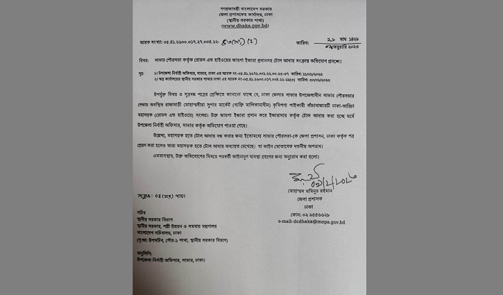 এছাড়া গত ৩১ জানুয়ারি সাভার পৌরসভার যে ইজারা তালিকা দেওয়া হয়েছে সেখানেও সড়ক/মহাসড়কে চাঁদা/টোল আদায় করা যাবে না বলে উল্লেখ করা হয়।