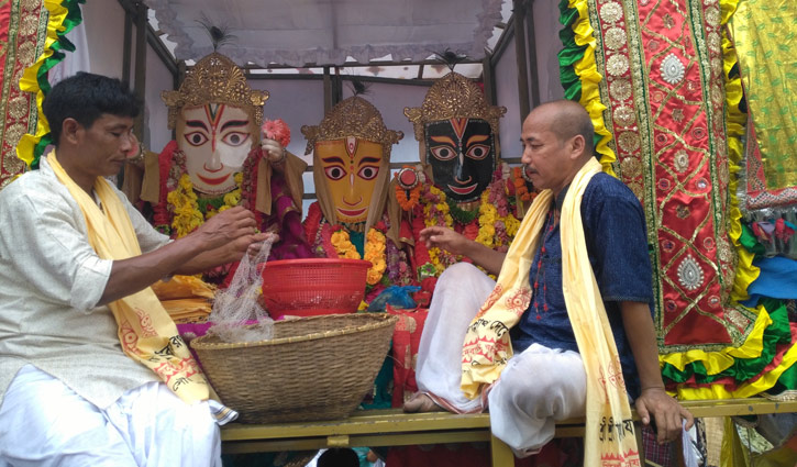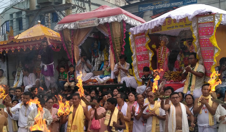 কথাগুলো বলার কারণ প্রতি বছর আষাঢ় মাস এলেই ডেনির কাছ থেকে নিমন্ত্রণ পাই সিলেটে মণিপুরী সম্প্রদায়ের ঐতিহ্যবাহী রথযাত্রা দর্শনের। প্রায় একশ চুরানব্বই বছর ধরে চলে আসছে এই রথযাত্রা উৎসব। কিন্তু সময় কেন জানি সময় দিচ্ছিল না। শেষপর্যন্ত উপস্থিত হলাম রথযাত্রায়। দূর থেকে দেখা পেলাম সেই কাঙ্ক্ষিত রথের যেখানে আসীন আছেন প্রভু জগন্নাথ, মাঝখানে তাঁর বোন সুভদ্রা এবং বামে বলরাম। শত শত পুণ্যার্থী রথ টেনে নিয়ে যাচ্ছেন। আমরা দূর থেকে প্রণাম করলাম। এদিকে আমাদের পাইলট সাহেব বললেন আজ এই সড়কে জ্যাম থাকবে, সামনেই মেলা বসেছে তাই আপনারা হেঁটে গেলে অনেক আগেই কাঙ্ক্ষিত গন্তব্যে পৌঁছাতে পারবেন।