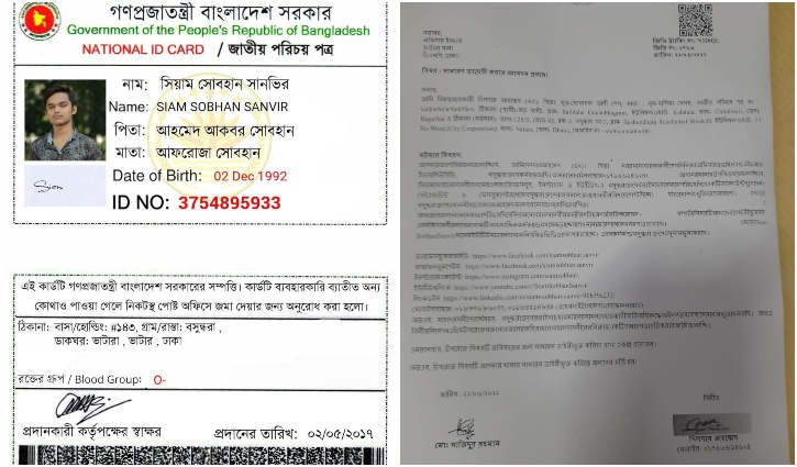 জাতীয় পরিচয়পত্র নম্বর ৩৭৫৪৮৯৫৯৩৩। ঠিকানা উল্লেখ করা হয়েছে : বাসা/হোল্ডিং ১৪৩, গ্রাম/রাস্তা বসুন্ধরা, ডাকঘর-ভাটারা, ভাটার, ঢাকা। জাতীয় পরিচয়পত্র ২ মে, ২০১৭ সালে হস্তান্তর করা হয় বলে উল্লেখ করা হয়েছে। ফ্লুজি গার্মেন্টস নামের একটি অস্তিত্ববিহীন প্রতিষ্ঠানের চেয়ারম্যান হিসেবেও দাবি করছেন এই প্রতারক। আর এসব ভুয়া তথ্য দিয়ে বেশ কয়েকটি ফেসবুক আইডি, ফেসবুক পেজ, ইউটিউব চ্যানেল, টুইটার ও লিকডইন অ্যাকাউন্ট খোলা হয়েছে।