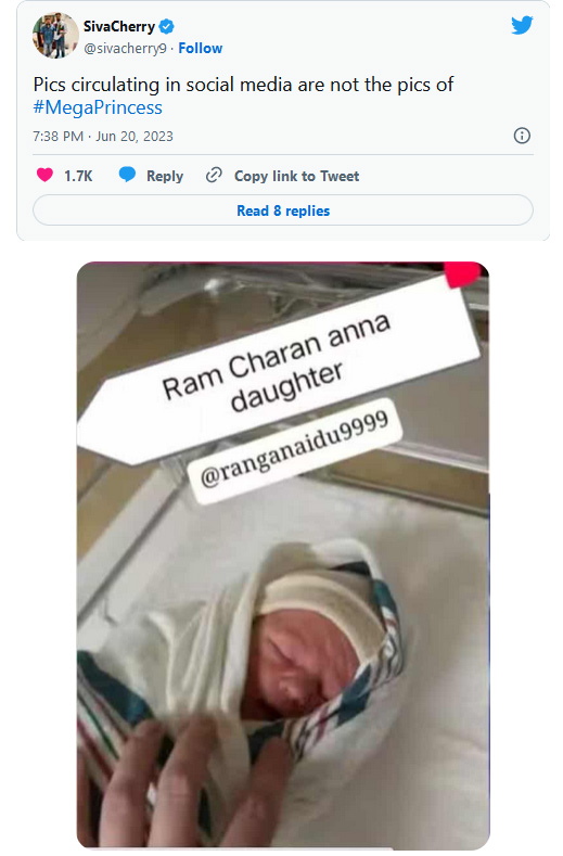 ছড়িয়ে পড়া ছবিটি টুইটারে পোস্ট করে রাম চরণের ম্যানেজার শিবা চেরি লিখেছেন, ‘সোশ্যাল মিডিয়ায় ছড়িয়ে পড়া ছবিটি মেগা প্রিন্সেসের (রাম চরণের কন্যা) নয়।’