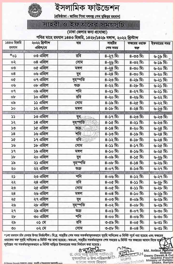 চাঁদ দেখা সাপেক্ষে আগামী ৩ এপ্রিল শুরু হবে পবিত্র রমজান মাস। ৩ এপ্রিল প্রথম রোজা ধরে ঢাকা জেলার জন্য সেহরি ও ইফতারের সময়সূচি প্রকাশ করেছে ইসলামিক ফাউন্ডেশন।