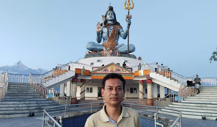 পোখরার পাহাড়ি গ্রামে পুমডিকোট শিব মন্দিরের সামনে লেখক