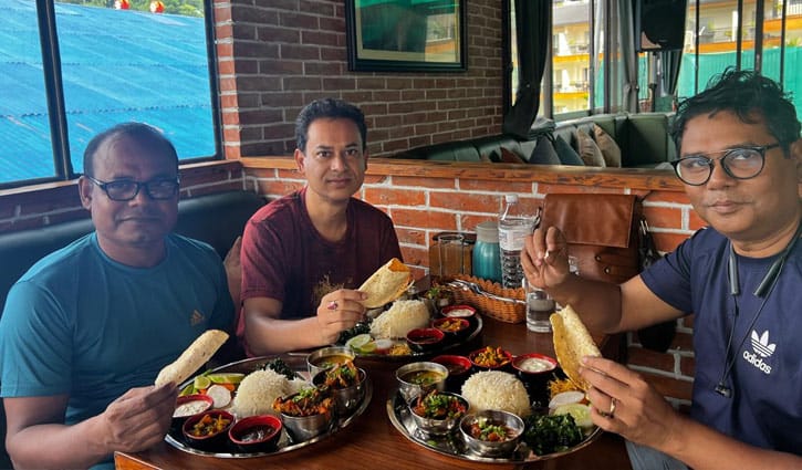 আরেকটি কথা, নেপালে পনির পাবেন প্রায় সব পদে। এমনকি পালং শাকেও! আর পাবেন বিভিন্ন পদের জিভে জল আনা মোমো। তবে যে থালির কথা বললাম, সেখানে ভাত ডাল শাক সবজি চাটনি পাঁপড় ছাড়াও আরেকটা জিনিস পেয়েছি- দই। পরিমাণে দুই আঙুলে উঠিয়ে তিনবার মুখে দেওয়ার মতো। বগুড়ার মানুষ অতটুকু বাটিতে দই দেখে তুলকালাম বাঁধালে দোষ দিলে অন্যায় হবে। তবে তাকে ঠান্ডা করতে হলে ঝটপট পাতে ডাল ঢেলে দিতে হবে। আহা! এমন স্বাদের ডাল খেয়েছি সেই ছেলেবেলায়। হ্যাঁ, কবুল করছি, নেপালে যে ক’দিন খেয়েছি আরাম করেই খেয়েছি। পেট একটুও বেগড়বাই করেনি। নো গ্যাস, নো এন্টাসিড। পানিটা শুধু বোতলজাত ছিল। পানশালার কথা উহ্য থাকুক। সে এক কাণ্ড বটে!