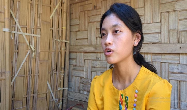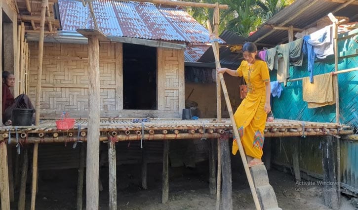 মাচার ঘরে বসে কথা বলেন খই খই সাই মারমা