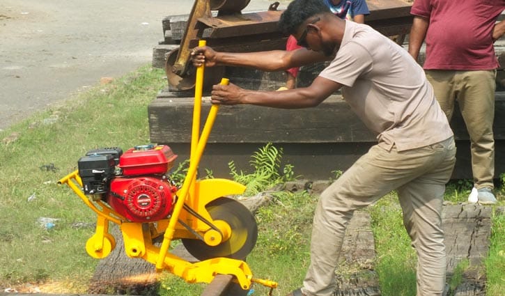 প্রকৌশলী নাজিবের তৈরি ‘রেল কাটিং মেশিন` দিয়ে পরীক্ষামূলক কাজ করছেন রেল কর্মচারীরা