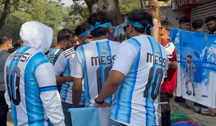মেসিকে স্বাগত জানাতে আগে থেকেই বহু সমর্থক কলকাতা বিমানবন্দরের সামনে জড়ো হন। ভারত ও আর্জেন্টিনার পতাকা নিয়ে উচ্ছ্বাসে মাতেন তারা। মেসি ও আর্জেন্টিনার জার্সি পরে রাস্তায় নেমে আসে হাজারো মানুষ।