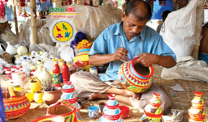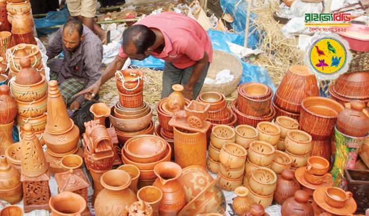 যেমন মৃৎশিল্পীদের তৈরি পোড়ামাটির রঙিন ছোটবড় নর-নারী বা প্রাণী বা পাখির মূর্তি। কাঠের তৈরি নানা ধরনের মূর্তিও দেখা গেছে মেলায়। এককথায় মৃৎশিল্প থেকে চারু ও কারুকর্মের বহু উপকরণ মেলার একটি কোণ ভরে তুলেছে। এগুলোর বেচাকেনাও ছিল যথেষ্ট পরিমাণে। গ্রামীণ শিল্পীরা তাদের শিল্পকর্ম নিয়ে অপেক্ষা করতেন মেলাগুলোর জন্য, বিশেষ করে বৈশাখী মেলার জন্য কারণ শেষোক্ত ক্ষেত্রে এগুলোর বিকিকিনি হতো অধিক পরিমাণে। বিক্রেতা শিল্পী হোক বা দোকানি হোক, ক্রেতা ছোট-বড় যে বয়সের হোক, নারী-পুরুষ ও সম্প্রদায় নির্বিশেষে সবার জন্য পয়লা বৈশাখের মেলা প্রাঙ্গণ আসলেই ছিল মিলন মেলা। হোক তা একদিনের, এর আনন্দ-আস্বাদই আলাদা। প্রয়োজন ও বিনোদন দু’দিক থেকে এ মেলার সাংস্কৃতিক তাৎপর্য ছিল সর্বজনীন চরিত্রের। এখনো বিক্রয় নিয়ে স্মরণ করি, ঘোমটা-টানা গ্রামীণ কৃষক গৃহবধূদের মেলায় উপস্থিতি। নিজে দেখেশুনে পছন্দ করে কিছু কিনবে বলে মেলায় আসা। এদিক থেকে ব্যতিক্রম গ্রামের সম্পন্ন পরিবারের মহিলারা।