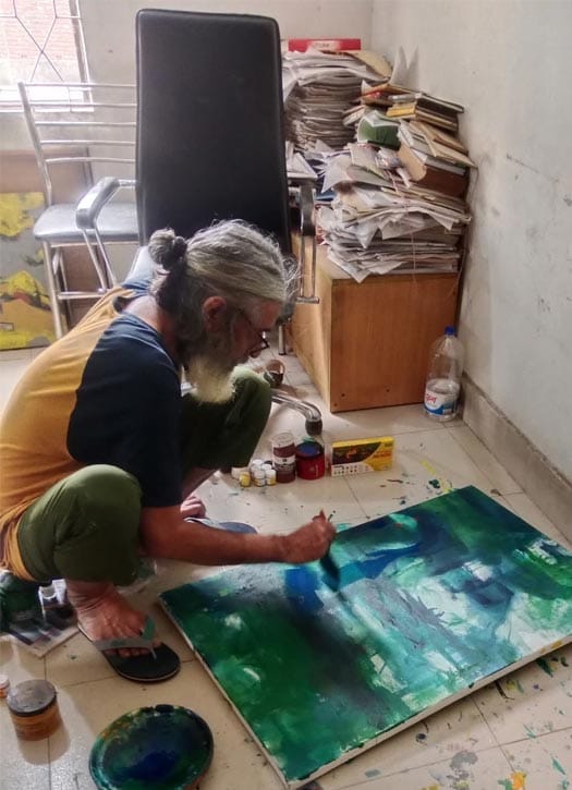 সদ্যবিদায়ী বছরের শেষ মুহূর্তে গিয়ে বললাম, ‘আমার ধারণা কয়েক বছরের মধ্যে আপনি সবচেয়ে বেশি পেইন্টিং করেছেন।’ শুনে বললেন, ‘কী-ই?’ তারপর ফিক করে হেসে দিলেন, ‘আমি সারাজীবন প্রচ্ছদের জন্য ছবি আঁকছি। শোনো পেইন্টিং করছি সেই চারুকলায়।’ আবদার করি, ‘একটা এগজিবিশন করব আমরা।’ ধমকের স্বরে বললেন, ‘কী? কী? মাথায় আনবা না এসব। আমার ওসবের দরকার নেই। বইয়ের প্রচ্ছদেই থাকতে চাই। যতদিন বাঁচি।’