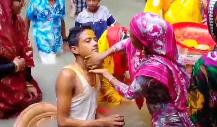 ভিডিওতে দেখা যায়, চারদিকে পানির মধ্যে উঠানে চেয়ার পেতে বর-বধূকে বসিয়ে হলুদ মাখিয়ে দিচ্ছেন আত্মীয়-স্বজনরা। তখন গান বাজতে শোনা যায়।