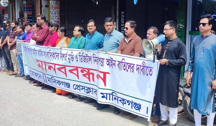 ডিজিটাল নিরাপত্তা আইনে গ্রেপ্তার সাংবাদিকদের মুক্তি এবং আইনটি বাতিলের দাবিতে মানিকগঞ্জের সংবাদকর্মীরা মানববন্ধন করেছেন।
