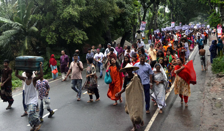 সড়কের দুধারে বিভিন্ন বয়সী উৎসুক মানুষ। সবারই রোমকূপ জেগে উঠলো। সবার ভেতরেই দোলা। হৃদয়ে শিহরণ। একটু পর পর তারা এদিক ওদিক তাকাচ্ছেন। হঠাৎ সড়কের দিকে স্থির দৃষ্টি। শত শত মানুষের দলবেঁধে হাঁটা। এ হাঁটা যেন অজানা এক গন্তব্যের দিকে। কারোও গায়ে জামা নেই। কারোও গায়ে থাকলেও সেটি ছেঁড়া। খালি গায়ে রুগ্ন শরীরে হেঁটে চলছে এই সড়ক বেয়ে। কেউ বা তার বৃদ্ধ মা বাবাকে কাঁধে তুলে হাঁটছে। আবার কেউবা সন্তানসম্ভবা স্ত্রীকে নিয়ে নিজেদের শেষ সম্বল নিয়ে অজানা ভবিষ্যতের দিকে যাচ্ছেন। দলবেঁধে এ যাত্রা ক্রমেই এগিয়ে যাচ্ছে এ সড়কের শেষে ভারতের আশ্রয় শিবিরে। পাক আর্মির বর্বরতা থেকে বাঁচতে নিরস্ত্র বাঙালিদের সীমান্ত পেরিয়ে ভারতে যাওয়ার এ যাত্রা।