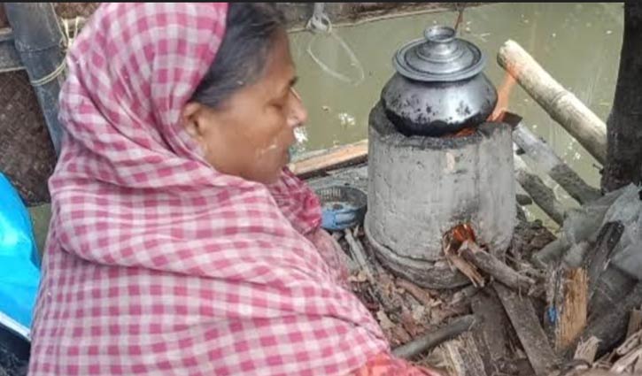মাটির চুলায় ভাত রান্না করছেন মিনারা বেগম