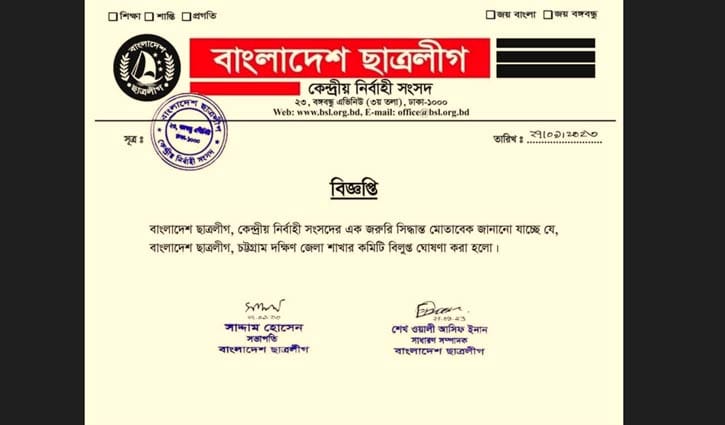 বিজ্ঞপ্তিতে বলা হয়েছে, বাংলাদেশ ছাত্রলীগের কেন্দ্রীয় নির্বাহী সংসদের সিদ্ধান্ত মোতাবেক জানানো যাচ্ছে যে, বাংলাদেশ ছাত্রলীগ, চট্টগ্রাম দক্ষিণ জেলা শাখার কমিটি বিলুপ্ত ঘোষণা করা হয়েছে।