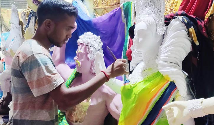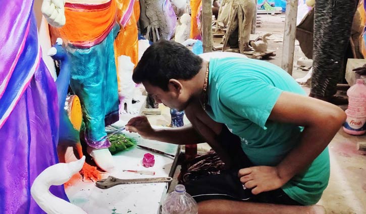 রং তুলির আঁচড়ে সাজছে দেবী দুর্গা