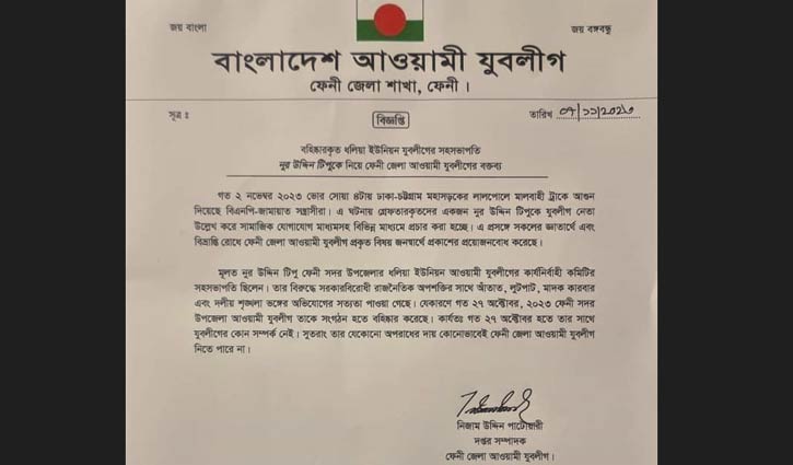 বিএনপির ডাকা অবরোধ চলাকালে ফেনীর লালপোলে ট্রাকে আগুন দেওয়ার ঘটনায় গ্রেপ্তারকৃত ফেনী সদর উপজেলার ধলিয়া ইউনিয়ন যুবলীগের সহ-সভাপতি নুর উদ্দিন টিপুকে সংগঠন থেকে আগেই বহিষ্কার করা হয়েছিল বলে জানিয়েছে যুবলীগ। গত ২৭ অক্টোবর এই নেতাকে বহিষ্কার করা হয় বলে গতকাল মঙ্গলবার (৭ নভেম্বর) ফেনী জেলা যুবলীগের দপ্তর সম্পাদক নিজাম উদ্দিন পাটোয়ারীর সই করা সংবাদ বিজ্ঞপ্তিতে জানানো হয়েছে।