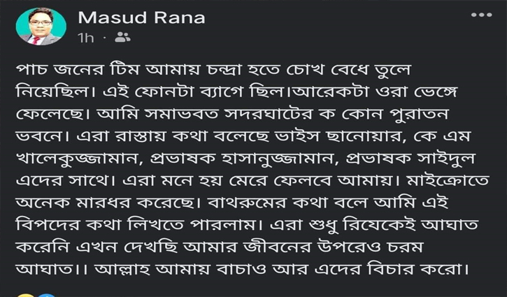 ফেসবুক আইডিতে লেখা হয়, ‘পাঁচ জনের টিম আমায় চন্দ্রা থেকে চোখ বেঁধে তুলে নিয়েছিল। এই ফোনটা ব্যাগে ছিল। আরেকটা ওরা ভেঙে ফেলেছে। আমি সম্ভবত সদরঘাটের কোনো পুরাতন ভবনে। এরা রাস্তায় কথা বলেছে কলেজের উপাধ্যক্ষ সানোয়ার, প্রভাষক কেএম খালেকুজ্জামান, হাসানুজ্জামান ও সাইদুলদের সঙ্গে। এরা মনে হয় মেরে ফেলবে আমায়। মাইক্রোতে অনেক মারধর করেছে। বাথরুমের কথা বলে আমি এই বিপদের কথা লিখতে পারলাম। এরা শুধু রিজিকেই আঘাত করেনি, এখন দেখছি আমার জীবনের ওপর চরম আঘাত। আল্লাহ আমায় বাঁচাও আর এদের বিচার কর।’