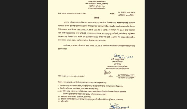 বিজ্ঞাপ্তিতে বলা হয়েছে, আগামী ৭ ডিসেম্বর (বৃহস্পতিবার) প্রধানমন্ত্রী গোপালগঞ্জ জেলার টুঙ্গিপাড়া সফর করবেন। প্রধানমন্ত্রীর সফর উপলক্ষে সার্বিক নিরাপত্তা নিশ্চিতকরণের অংশ হিসাবে অস্ত্র আইন ১৮৭৮ এর ধারা ১৭ (ক) (১) এর প্রদত্ত ক্ষমতাবলে জেলার গোপালগঞ্জ সদর, কোটালীপাড়া ও টুঙ্গিপাড়া উপজেলায় ৫ ডিসেম্বর হতে ১১ ডিসেম্বর পযর্ন্ত মোট ৭ দিন অস্ত্রের লাইসেন্সধারীগণ কৃর্তক অস্ত্রসহ চলাচল, বহন ও প্রদর্শন করার উপর নিষেধাজ্ঞা আরোপ করা হলো।