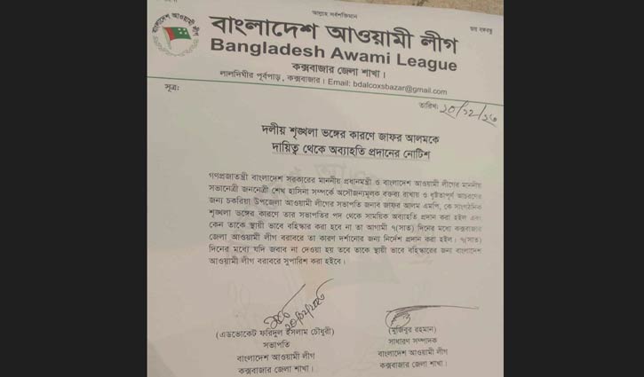 নোটিশে বলা হয়, প্রধানমন্ত্রী ও বাংলাদেশ আওয়ামী লীগের সভাপতি শেখ হাসিনার বিরুদ্ধে অসৌজন্যমূলক বক্তব্য রাখা ও ধৃষ্টতাপূর্ণ আচরণ করায় চকরিয়া উপজেলা আওয়ামী লীগের সভাপতি জাফর আলম এমপিকে সাংগঠনিক শৃঙ্খলা ভঙ্গের কারণে দলীয় পদ থেকে সাময়িক অব্যাহতি দেওয়া হয়েছে। কেন তাকে স্থায়ী বহিষ্কার করা হবে না তা আগামী সাত দিনের মধ্যে জেলা আওয়ামী লীগ বরাবর লিখিতভাবে জানাতে বলা হয়েছে।