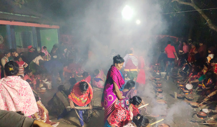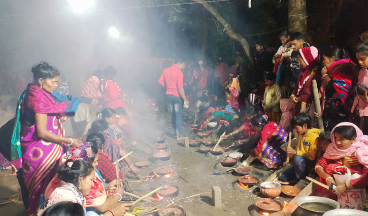 সরেজমিন দেখা গেছে, শীত উপেক্ষা করে শত শত মানুষ উপস্থিত হয়েছে। অনেক দম্পত্তির কোলে ছোট সন্তান রয়েছে। একটি মাঠে সারি করে পরস্পর ১০৮টি মাটির চুলা তৈরি করা হয়েছে। সেই চুলার উপর সাজানো রয়েছে চিতই পিঠা তৈরির মাটির সাচ। মন্দিরের পুরোহিত দেবলাল চুলাগুলোর প্রতিটিতে পর্যাক্রমে লোহার পাত দিয়ে আঘাত, চুলায় থাকা সাচে ফুল ও পরে চুলায় আগুন দিয়ে অনুষ্ঠান শুরু করেন। এ সময় পাশে বাজানো হয় ঢোল-তবলা আর হিন্দু নারীরা উলু ধ্বনি দেন। ১০৮টি চুলায় পর্যাক্রমে পিঠা তৈরিতে অংশ নেন বিভিন্ন স্থান থেকে আসা বিভিন্ন বয়সের নারীরা। আর উদযাপন কমিটির সদস্যরা পিঠা তৈরির উপকরণ সরবরাহ করেন।