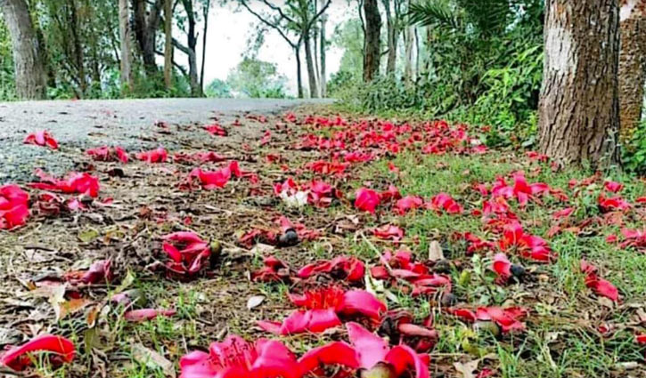 এখন ফাগুন। বসন্তের আবহে গাছে গাছে পরিপক্ব শিমুল ফুল। গাছতলায়ও বিছানো অজস্র ফুল। কাকডাকা ভোরে গাছে থোকায় থোকায় ফুল আর রাস্তায় ঝরে পড়া ফুলগুলো দেখে মনে অন্য রকম এক অনুভূতি জাগে।