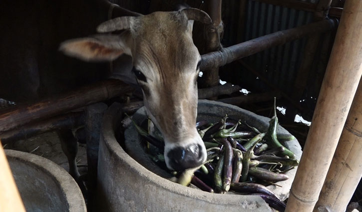 বুধবার (৩ এপ্রিল) সকালে রংপুরের পীরগাছা উপজেলার ছাওলার তেলিপাড়া এলাকার কৃষক আশরাফুল ইসলামের বাড়িতে গিয়ে দেখা যায়, গরুকে খাওয়ানো হচ্ছে বেগুন।
