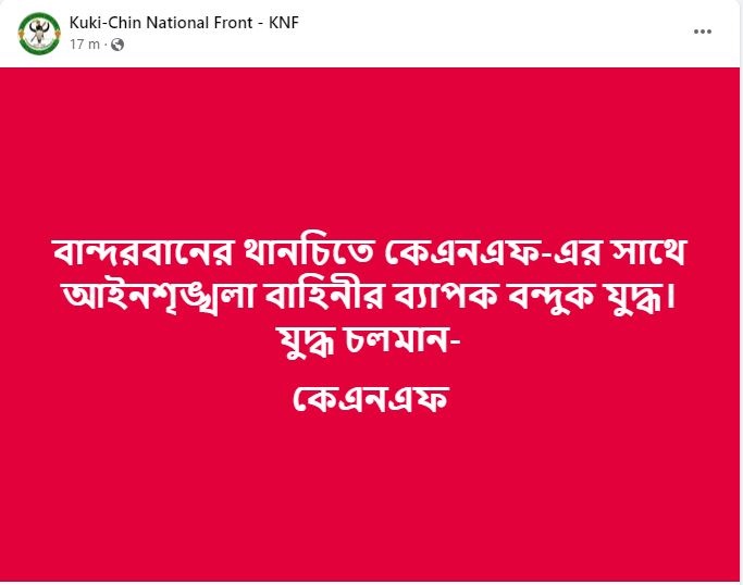 এদিকে, কুকি-চিন ন্যাশনাল ফ্রন্ট (কেএনএফ) নামে একটি ফেসবুক পেজ থেকে জানানো হয়, বান্দরবানের থানচিতে কেএনএফ’র সাথে আইনশৃঙ্খলা বাহিনীর ব্যাপক বন্দুক যুদ্ধ। যুদ্ধ চলমান-’।