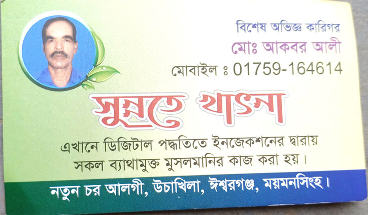 খতনাকারী আকবর আলী উপজেলার উচাখিলা ইউনিয়নের নতুন চর-আলগী গ্রামের বাসিন্দা।