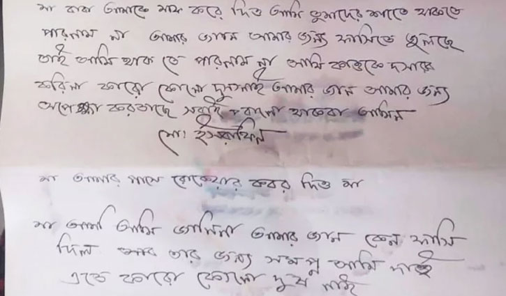 চিরকুটে লেখা রয়েছে, ‘মা-বাবা আমাকে মাফ করে দিও, আমি তোমাদের সাথে থাকতে পারলাম না। আমার জান আমার জন্য ফাঁসিতে ঝুলেছে। তাই আমি থাকতে পারলাম না। আমি কাউকে দোষারোপ করি না। কারও কোনো দোষ নাই। আমার জান আমার জন্য অপেক্ষা করতাছে। সবাই ভালো থাকবা। মো. ইসরাফিল। মা আমার পাশে রোকেয়ার কবর দিও মা। মা আমি জানি না আমার জান কেন ফাঁস দিল। তার জন্য সম্পূর্ণ আমি দায়ী। এতে কারও কোনো দোষ নাই।’