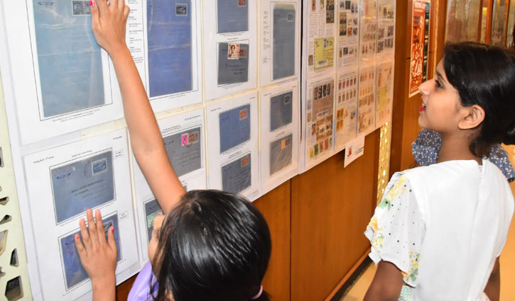 প্রদর্শনীতে ডাকটিকিট দেখছেন কয়েকজন দর্শনার্থী