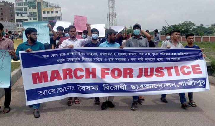 শিক্ষার্থীরা জানান, বৈষম্যবিরোধী ছাত্র আন্দোলন ঘোষিত ‘মার্চ ফর জাস্টিস’ কর্মসূচির অংশ হিসেবে সকালে সাড়ে ১১টার দিকে গাজীপুর শহরের রাজবাড়ী রোডের জেলা প্রশাসকের কাযালয়ের সামনে জড়ো হন শিক্ষার্থীরা। এসময়ে পুলিশ এসে সড়কের দুই পাশে প্রতিবন্ধকতার সৃষ্টি করে। শিক্ষার্থীরা দুপুর ১টার দিকে জেলা শহরের রেলক্রসিং এলাকা থেকে বিক্ষোভ মিছিল বের করে। এসময়ে আশপাশের এলাকা থেকে শিক্ষার্থীরা মিছিলে যোগ দেয়। মিছিলটি শিববাড়ি হয়ে শিমুলতলীর ডুয়েটের দিকে যেতে থাকে। বটতলা এলাকায় পৌঁছালে পুলিশ লাঠিচার্জ করে। এসময় শিক্ষার্থীদের সঙ্গে পুলিশের ধাওয়া-পাল্টা ধাওয়া হয়। এসময় কয়েক জনকে আটক করে পুলিশ। দুপুর আড়াইটার দিকে পরিস্থিতি স্বাভাবিক হয়।