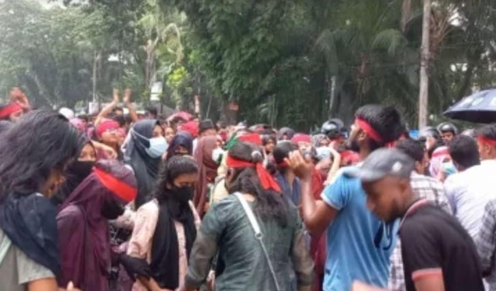চাঁদপুরে মাথায় লাল কাপড় বেঁধে বিক্ষোভ করেন আন্দোলনরত শিক্ষার্থীরা