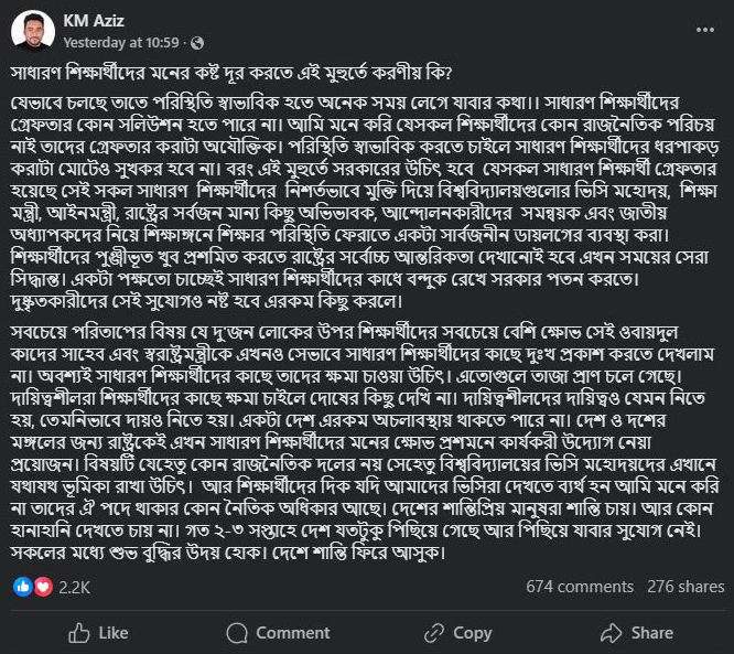 ফেসবুক পোস্টে আরও বলা হয়, ‘শিক্ষার্থীদের পুঞ্জীভূত ক্ষোভ প্রশমিত করতে রাষ্ট্রের সর্বোচ্চ আন্তরিকতা দেখানোই হবে সময়ের সেরা সিদ্ধান্ত। একটা পক্ষ তো চাচ্ছেই সাধারণ শিক্ষার্থীদের কাঁধে বন্দুক রেখে সরকার পতন করতে। দুষ্কৃতকারীদের সেই সুযোগও নষ্ট হবে এ রকম কিছু করলে। সবচেয়ে পরিতাপের বিষয় যে দুজন লোকের ওপর শিক্ষার্থীদের সবচেয়ে বেশি ক্ষোভ, সেই ওবায়দুল কাদের সাহেব এবং স্বরাষ্ট্রমন্ত্রীকে এখনো শিক্ষার্থীদের কাছে দুঃখ প্রকাশ করতে দেখলাম না। অবশ্যই শিক্ষার্থীদের কাছে তাঁদের ক্ষমা চাওয়া উচিত। এতগুলো তাজা প্রাণ চলে গেছে। দায়িত্বশীলরা শিক্ষার্থীদের কাছে ক্ষমা চাইলে দোষের কিছু দেখি না। দায়িত্বশীলদের দায়িত্বও যেমন নিতে হয়, তেমনিভাবে দায়ও নিতে হয়। একটা দেশ এরকম অচল অবস্থায় থাকতে পারে না।’ পোস্টে দেশের মঙ্গলে রাষ্ট্রকেই শিক্ষার্থীদের মনের ক্ষোভ প্রশমনে কার্যকর উদ্যোগ নেওয়া প্রয়োজন বলে তিনি মত দেন।