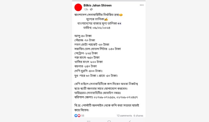 চৌমাথা বাজারে সবজি কিনতে আসা নাজমুল ইসলাম বলেন, ‘সেনাবাহিনী বাজার দর নির্ধারণ করে দিয়েছে এমন একটি ফেসবুক পোস্ট দেখে বাজারে এসেছি। এখানে এসে দেখি প্রতিটি পণ্যই আগের দামেই বিক্রি করছেন ব্যবসায়ীরা। আগেও পেঁয়াজ ১১০টাকা কেজি দরে কিনেছি। আজও সেই একই দামে পেঁয়াজ কিনলাম। বরং কাঁচা মরিচের দাম আগের চেয়ে অনেক বেড়েছে। আধাকেজি মরিচ কিনলাম ১৪০ টাকা দিয়ে। ফেসবুকের পোস্ট দেখে ধোঁকা খেয়েছি।’
