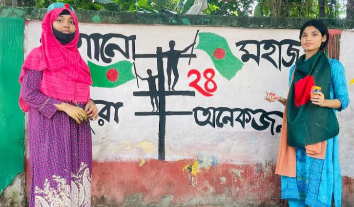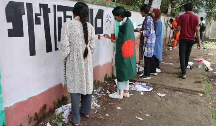 শিক্ষার্থীরা আরও জানান, দেয়ালকে বর্ণমালা আর ছবিতে উপস্থাপন করার চেষ্টা করছেন তারা। তারুণ্যের শক্তিতে বাংলাদেশ জেগে উঠেছে। প্রাণের টানে তারা এসেছেন, কাজ করছেন। অন্যায় প্রতিরোধ ও দেশ গড়ার কাজে তারা কখনো পিছিয়ে থাকবেন না।