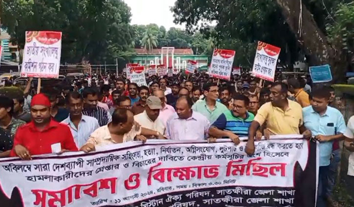 দেশব্যাপী সাম্প্রদায়িক সহিংসতা, হত্যা, নির্যাতন, অগ্নিসংযোগ, লুটপাট ও চাঁদাবাজি বন্ধ এবং হামলাকারীদের গ্রেপ্তার ও বিচারের দাবিতে সাতক্ষীরায় সমাবেশ ও বিক্ষোভ মিছিল অনুষ্ঠিত হয়েছে।