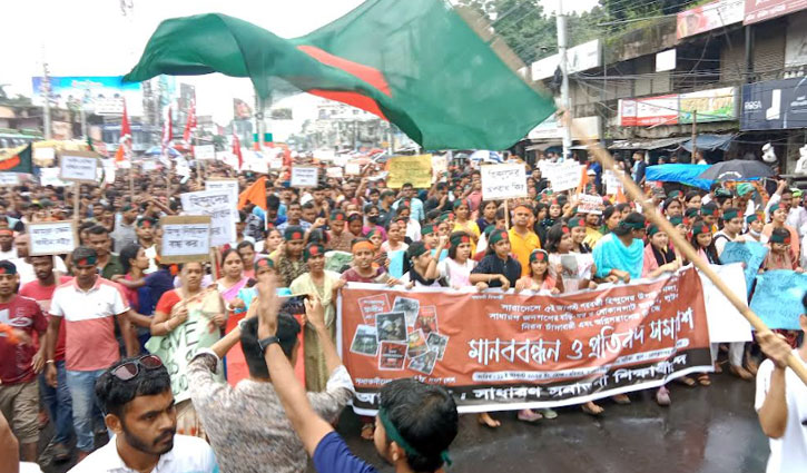রোববার (১১ আগস্ট) দেশের বিভিন্ন জেলায় মানববন্ধন, মিছিল ও বিক্ষোভ সমাবেশ করেন তারা।