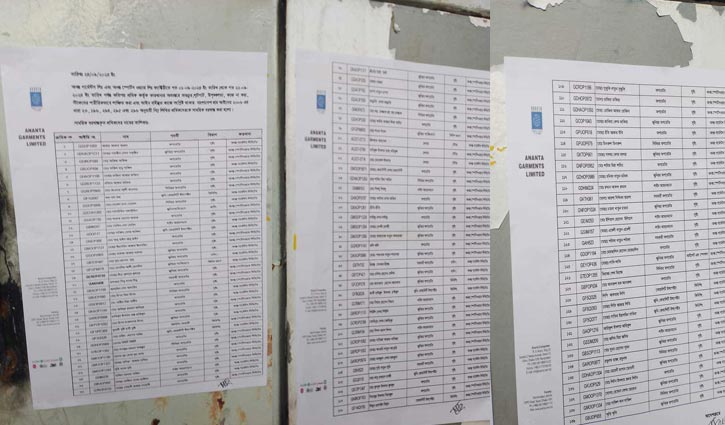 সাভারের আশুলিয়ার নিশ্চিন্তপুর এলাকায় অনন্ত গার্মেন্টস ও অনন্ত স্পোর্টস ওয়্যারের ১২০ শ্রমিককে সাময়িক বরখাস্ত করা হয়েছে বলে অভিযোগ পাওয়া গেছে। মঙ্গলবারের ২৪ সেপ্টেম্বর তারিখ দেওয়া বরখাস্তের তালিকা বুধবার (২৫ সেপ্টেম্বর) কারখানার ফটকে সাঁটিয়ে দেয় কর্তৃপক্ষ বলে জানিয়েছেন শ্রমিকরা।