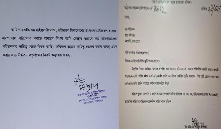 শিক্ষার্থীদের আন্দোলনের মুখে গত রোববার (২৯ সেপ্টেম্বর) পদত্যাগপত্রে সই করেন বরিশাল শের-ই-বাংলা মেডিক্যাল কলেজ (শেবাচিম) হাসপাতালের পরিচালক ডা. এইচএম সাইফুল ইসলাম। সেদিনই তিনি স্বাস্থ্য অধিদপ্তরের মহাপরিচালক বরাবর চার দিনের নৈমিত্তিক ছুটির আবেদন করেন। একই চিঠিতে পরিচালকের দায়িত্ব দেন উপ-পরিচালক ডা. এস এম মনিরুজ্জামানকে। এ ঘটনায় পরিচালকের পদত্যাগ নিয়ে কর্মকর্তা-কর্মচারীদের মধ্যে ধোঁয়াশা সৃষ্টি হয়েছে।